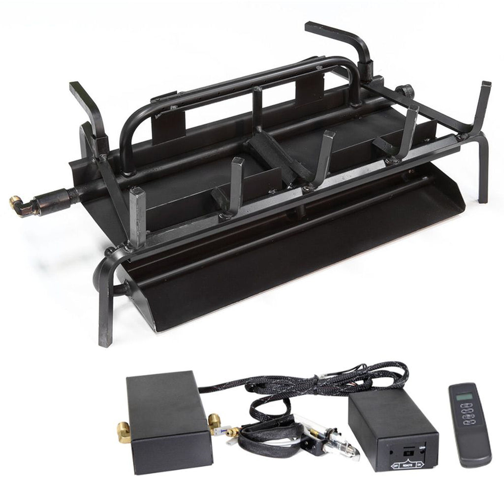 Grand Canyon 3 Burner System with Battery Electronic and Remote System provides a high quality burner component to help complete your ideal gas fireplace with a battery powered electronic ignition and remote system for reliable and easy ignition. Grand Canyon's 3 Burner system features a 304 stainless steel chassis for ultimate durability and performance while allowing for gas to flow in from either side of the burner. With 1 elevated back burner that stretches across the entire rear of the burner, 1 middle burner that rolls over the front log, and 1 ember burner, this component is sure to create enough heat to give your living space a much more comfortable atmosphere while the burner tines can be raised or lowered depending on the size of your fireplace opening and preferred log style. This burner package comes complete with metal bar stock and burner pipes, lava rock, necessary fittings, a flex line and the ember damper clamp. With (6) different burner size options and a propane or natural gas option, Grand Canyon has ensured a burner that will fit any style of indoor living space, allowing you to achieve an area that your friends and family will love for years to come.